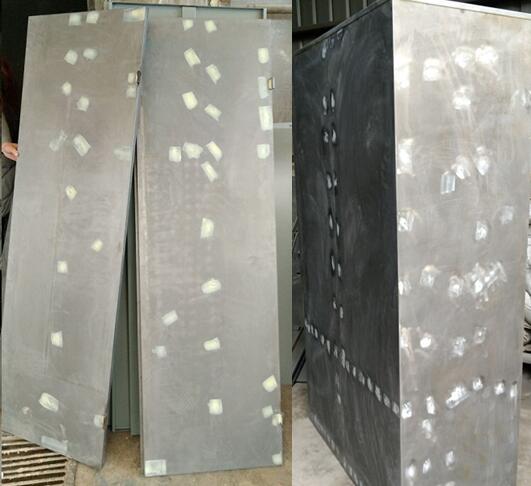 如圖是浦豐柜業焊接的重型工具柜表面處理過程中的照片。有白點的地方都是厚板焊透后人工打磨凸起的鋼板表面。只有工具柜內加強筋和柜體焊透才能保證固體的牢固性。每個焊點再采取汽車表面修補漆面的工藝,進行人工修補原子灰,再進行表面靜電噴塑處理。